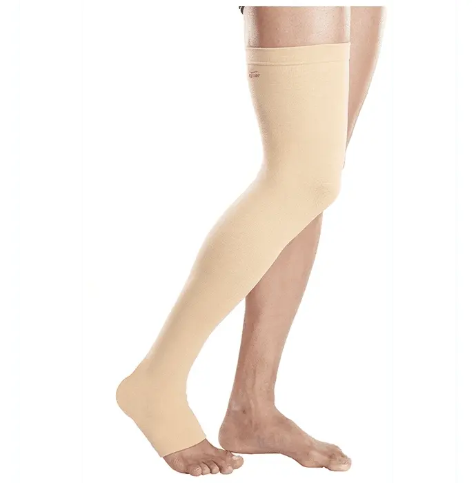 Extended Thigh-High Coverage - Mid thigh compression stockings extend from toes to mid-thigh level, providing comprehensive graduated compression support for the entire leg, ideal for varicose veins, swelling, or circulation issues affecting both lower and upper leg areas Medical-Grade Graduated Compression - Delivers clinically proven graduated pressure (firmest at ankle 20-30 mmHg, gradually decreasing up the leg) that improves venous blood return, reduces leg swelling, prevents blood clots, and manages severe varicose veins throughout the entire leg Secure Silicone Grip Band - Features medical-grade silicone top band that stays securely in place without rolling, sliding, or requiring garters, ensuring consistent compression therapy and all-day comfort even during movement and activity Superior Leg & Thigh Support - Provides therapeutic compression coverage for conditions affecting the full leg including thigh varicose veins, post-surgical swelling, lymphedema, deep vein thrombosis prevention, pregnancy-related vein issues, and severe chronic venous insufficiency Premium Breathable Fabric - Constructed from high-quality medical elastic with moisture-wicking properties that keep legs cool, dry, and comfortable throughout extended wear while maintaining consistent therapeutic compression even after multiple washes Classic Professional Design - Available in neutral colors (beige, black, navy) with closed-toe or open-toe options and sheer or opaque finishes, suitable for professional settings, medical recovery, daily wear, and special occasions with discreet, elegant appearance Multiple Compression Classes - Choose from Class I (15-20 mmHg), Class II (20-30 mmHg), or Class III (30-40 mmHg) compression levels based on medical condition severity, doctor's prescription, prevention needs, or therapeutic requirements for optimal results